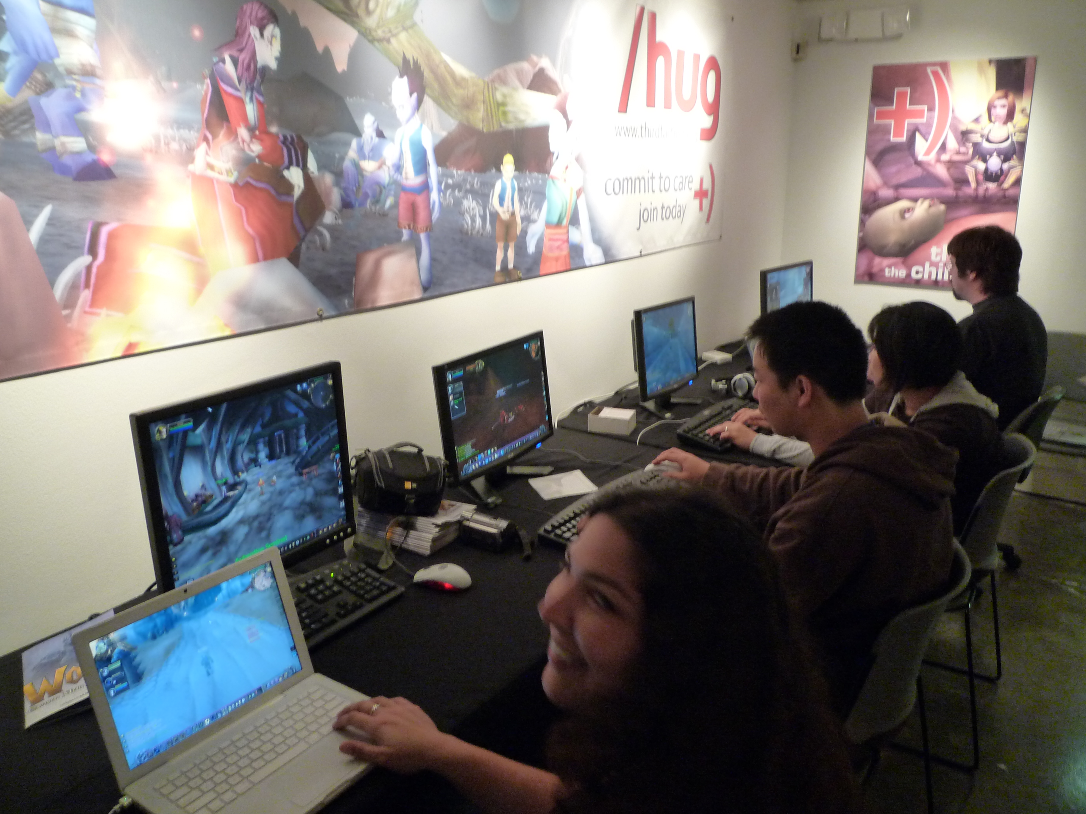 “/hug” [ or slashhug] is a Third Faction project which seeks to establish a non governmental aid organization in World of Warcraft. This exhibit is a mixed reality installation that demonstrates the work of the /hug collective and is inspired in part by the Red Cross. This installation encourages viewer interaction by prompting them to carry out missions via hands-on participation at field stations located in the gallery space..